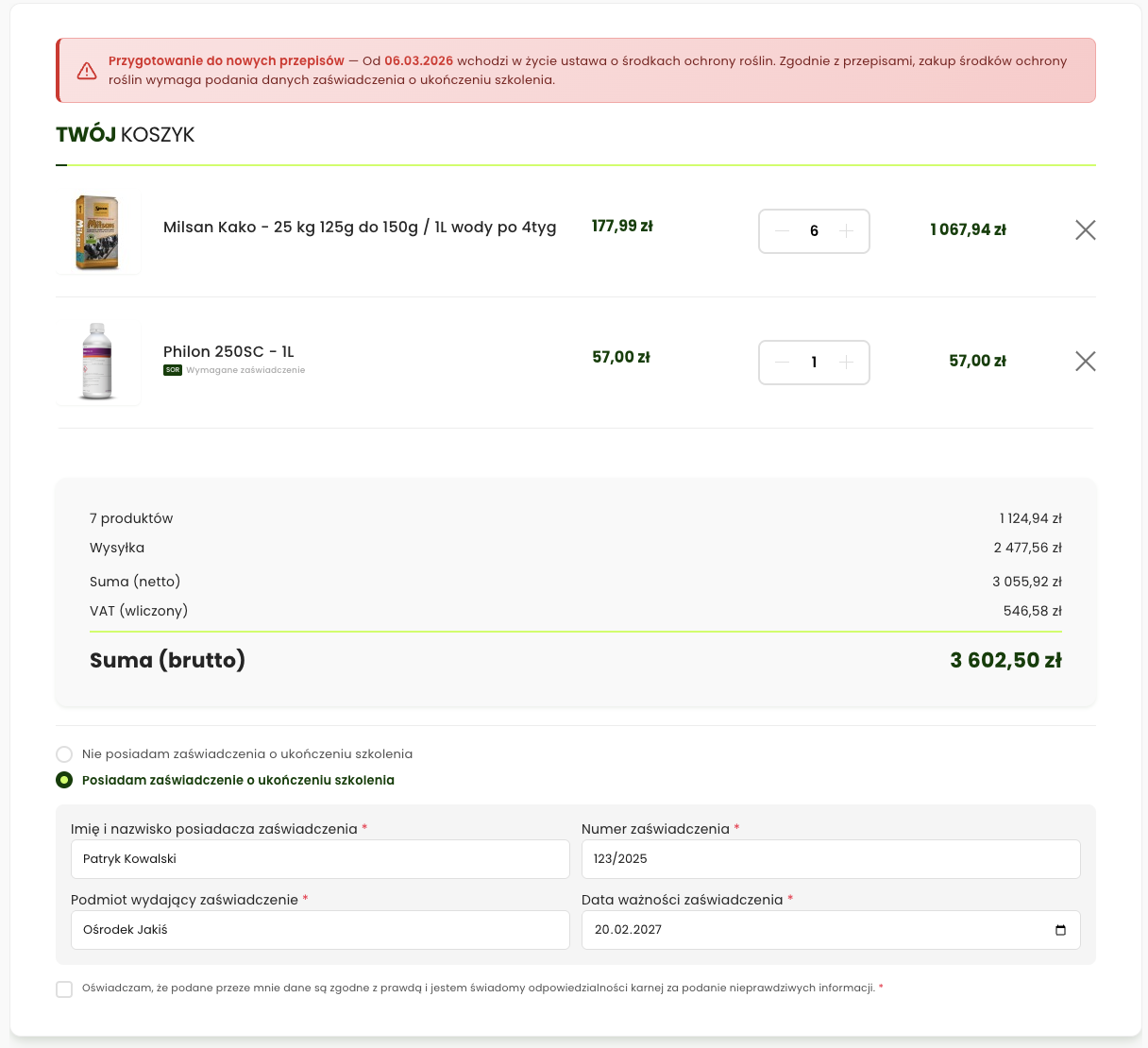 Blokada zakupu bez certyfikatu Automatyczne zatrzymanie zamówienia przy braku ważnego certyfikatu