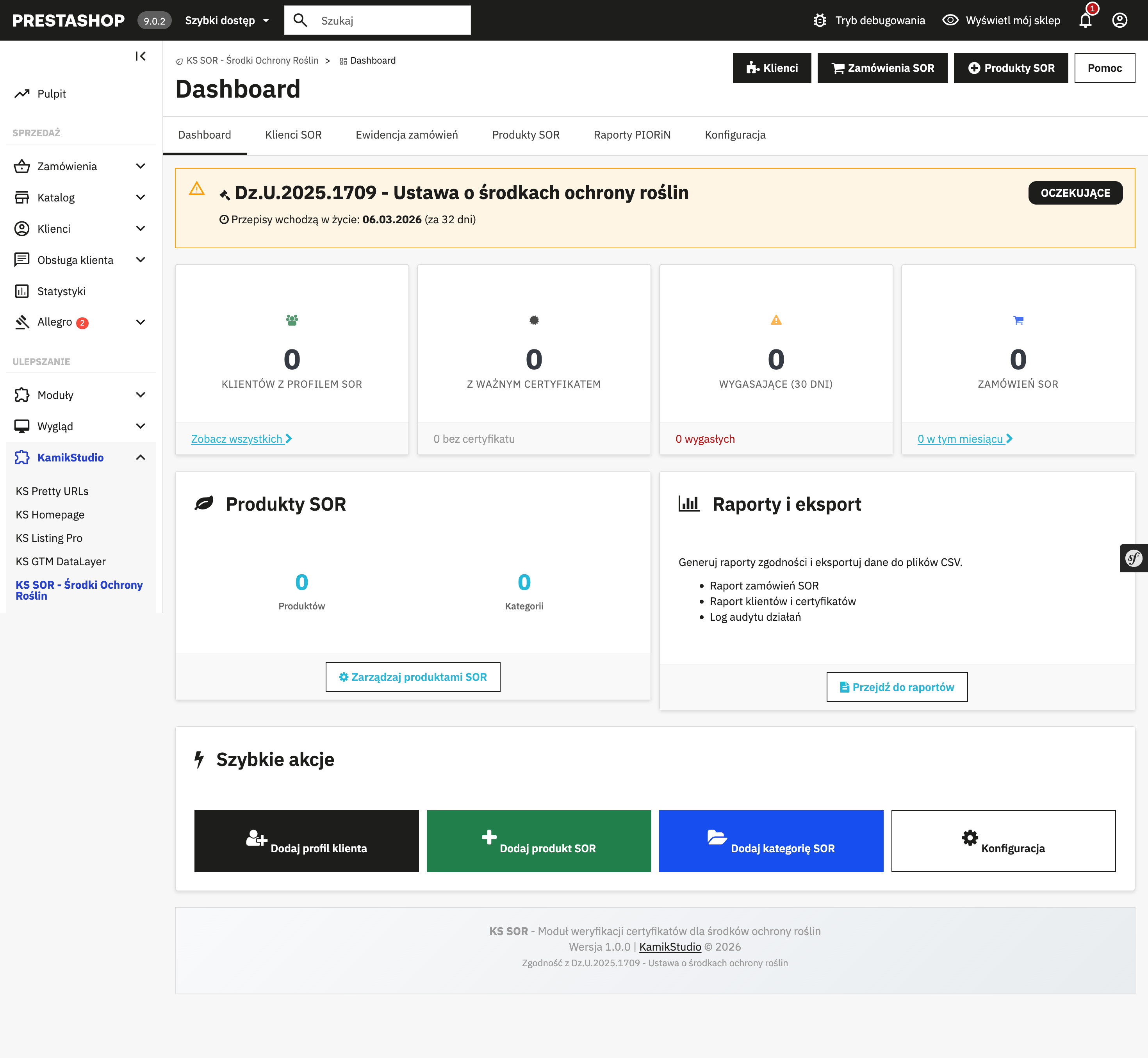 KS SOR to profesjonalny moduł dla PrestaShop 8.x i 9.x, który zapewnia zgodność sklepów internetowych z ustawą o środkach ochrony roślin (Dz.U.2024.630 z nowelizacją Dz.U.2025.1709).