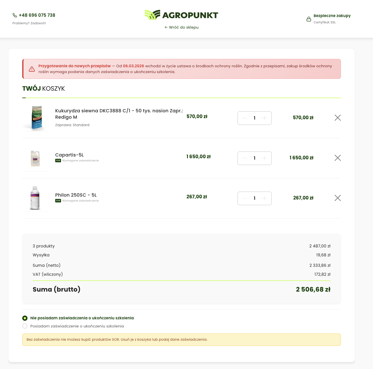 Ostrzeżenia w koszyku Informacja o wymaganiach gdy koszyk zawiera produkty SOR